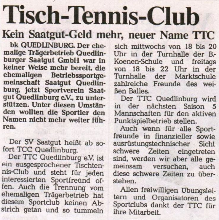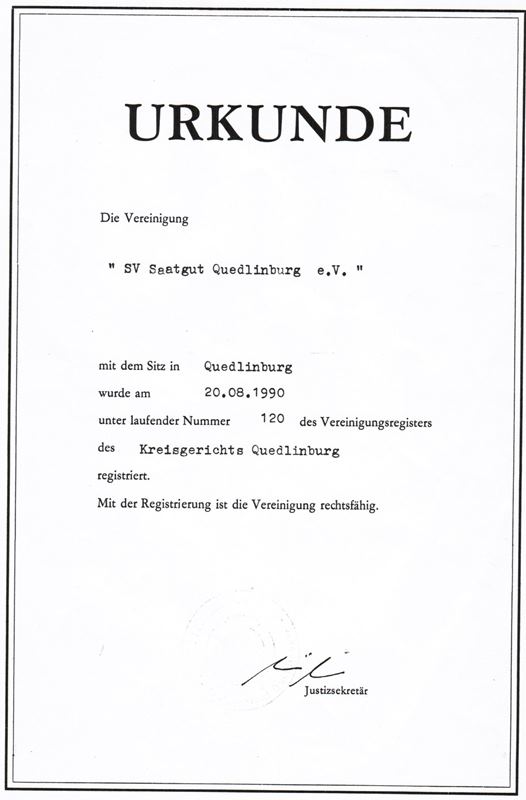 Umwandlung in SV "Saatgut" Quedlinburg e.V.